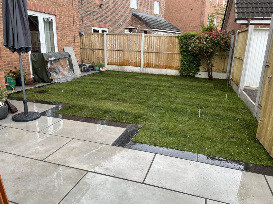 We’ve recently completed a garden project in Stone which included: 20sqm porcelain tiled patio area with contrasting granite border & decking lights 18sqm of turf replaced Before Work under-way After